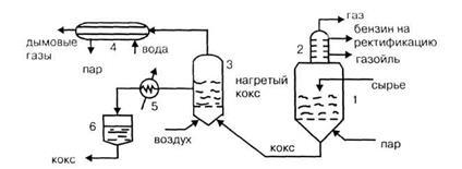 дистиллят, направляемый на ректификацию, и газойль. Коксовый теплоноситель из реактора подается в коксонагреватель 3, где частично сжигается в токе воздуха. Нагретый кокс охлаждается в коксовом холодильнике 5 и поступает в бункер кокса 6, а частично возвращается в реактор 1. Дымовые газы из коксонагревателя 3 проходят котел-утилизатор 4 и выбрасываются в атмосферу.