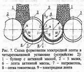 Сформулированы принципы синтеза установок формования ЭЛ, состоящие в том, что: 1) разработка и оптимизация процесса формования должна проводиться совместно с разработкой и оптимизацией параметров формующих устройств; 2) должны как можно более полно выявляться связи параметров оборудования и эксплуатационных характеристик электродов, а разрабатываемые математические модели должны включать как параметры процесса формования, так и параметры оборудования; 3) устройства должны: а) обеспечивать непрерывный процесс формования, высокую производительность и автоматический или полуавтоматический режим работы, б) быть универсальными, т.е. перенастраиваться на любой тип электродов из выпускаемой номенклатуры, в) обеспечивать за счет перенастройки, например, сменой валков, и заложенных широких диапазонов регулирования оптимальные эксплуатационные характеристики электродов всей номенклатуры. Именно эти принципы выдерживались при создании установок формования.