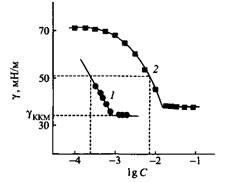 Поразительное свойством димерных ПАВ состоит в том, что мицеллобразование в их растворах начинается при концентрациях на порядок ниже, чем для соответствующих «мономерных» ПАВ. Низкое значение KKM — важнейшее свойство, означающее, что димерные ПАВ очень эффективны при солюбилизации неполярных соединений. Эффективность снижения поверхностного натяжения, выраженная величиной С20, также выше для димерных ПАВ. Поверхностное натяжение для растворов таких ПАВ в точке KKMниже, чем для растворов «мономерных» ПАВ. На рис. 3 в качестве примера приведены изотермы поверхностного натяжения катионного димерного ПАВ и соответствующего мономерного соединения. Интересно сравнить свойства катионного димерного ПАВ, которое содержит два гидрофобных радикала и две гидрофильные группы, с обычным катионным ПАВ, содержащим два таких же гидрофобных радикала и одну полярную группу. KKM бромида ди-децилдиметиламмония равна 1.8 · IO3