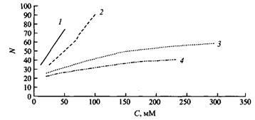 Рис. 6. Зависимость мицеллярных чисел агрегации Nот концентрации С катионных димерных ПАВ, содержащих гидрофобную группу С12Н25 и мостики разной длины. Длина мостика: три метиленовые группы, четыре метиленовые группы, пять метиленовых групп. Для сравнения представлены данные для мономерного аналога.