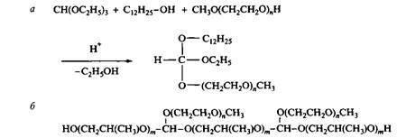 Ортоэфиры относятся к новому классу недавно полученных поверхностно-активных веществ. Ортоэфирные ПАВ получают переэтерификацией низкомолекулярного ортоэфира, например при взаимодействии триэтилортоформиата с жирным спиртом и полиэтиленгликолем. Структуры молекул типичных ортоэфирных ПАВ и способы их получения приведены на рис. 12.