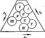 При анализе многокомпонентных смесей, содержащих соединения различной химической природы, часто наблюдается перекрывание некоторых тиков. Наилучшим способом оптимизации разделения в этом случае является изменение селективности подвижной фазы при той же самой элюирующей силе. Селективность растворителей определяется соотношением вкладов различных типов межмолекулярных взаимодействий в системе растворитель — вещество. На предложенной Снайдером треугольной диаграмме растворители разбиты на восемь групп, различающихся по типу селективности (рис.1.1). Крайние группы I, II, V я VIII имеют наиболее ярко выраженную селективность: в группу Iходят акцепторы протонов (простые эфиры, амины), в группу VIII—доноры протонов (хлороформ, вода, м-крезол), в группу II—доноры-акцепторы (спирты) и в группу V—растворители, предпочтительно взаимодействующие с веществами, имеющими большой дипольный момент (метиленхлорид, дихлорэтан), Растворители группы VII (ароматические соединения, нитроалканы) характеризуются повышенным взаимодействием с акцепторами электронов. Принадлежность растворителя к определенной группе также указана в приложении 2.