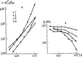 Рис 1. Температурная зависимость удельного объема (а) и параметра В (б) для образцов ИПС (1), КПС (2), ЦПС (3) и БПС (4)