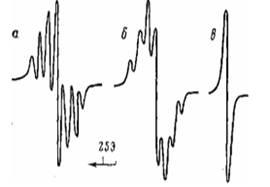 Рис. 1. Спектры ЭПР захваченных радикалов в пленках ПЭВП (а) и ПЭНП (б), замороженных до -196° после f-облучения в вакууме при комнатной температуре до дозы0,40 МГр и в пленке ПЭВП (в),