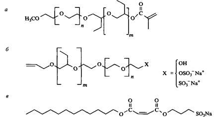 Рис. 3. Примеры полимеризующихся ПАВ: а — метакрилат блок-сополимера этиленоксида и бутиленоксида с концевой метальной группой; б—блок-сополимер бутиленоксида и этиленоксида с аллильной концевой группой и с различными группами на другом конце; в — монододецилмоно-сульфопропилмалеат