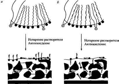 На рис. 8 представлена схема процесса отверждения алкидной эмульсии в присутствии обычного ПАВ и ПАВ, способного к сополимеризации с ненасыщенными ацильными цепями вяжущего.