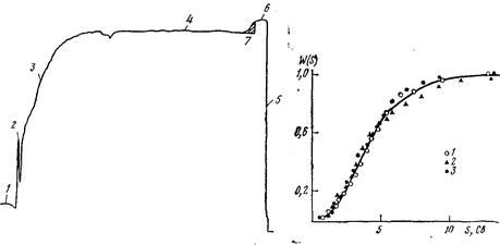 = =7,8—17,9%. Как видно из рис. 2, зависимости W(S) для трех образцов с хорошей точностью ложатся на одну кривую, т. е. средние молекулярные массы их одинаковы. На фотометрограммах рис. 1, соответствующих временам опыта сразу после достижения скорости вращения 50 000 об/мин, всегда регистрировали в придонной области кюветы избыточное над уровнем плато поглощение света, площадь которого составляет 1—2% от площади седиментирующей границы. По-видимому, эта осажденная часть образца является микрогелем.