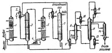 где при 100°С обрабатывается щелочью (30%-ное известковое молоко). Реакционную массу подогревают паром, вводимым в нижнюю часть колонны. Получаемая в результате омыления этиленхлоргидрина окись этилена вместе с парами побочных продуктов (дихлорэтан, ацетальдегид) через дефлегматор 5 поступает в конденсатор 7, охлаждаемый водой или рассолом. Конденсат разделяют в ректификационной тарельчатой колонне 9. Дистиллятом этой колонны является окись этилена, направляемая после ожижения в конденсаторе 8 на дальнейшее использование.