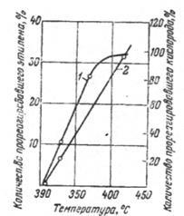 2. Количество реагирующего кислорода сначала быстро растет с повышением температуры – при 360°С в реакцию вступает более 80% исходного кислорода. Выше этой температуры кривая расхода кислорода резко изменяет свой наклон и асимптотически приближается к 100% .