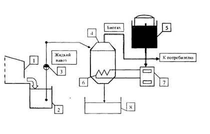 Согласно этой схеме навоз из животноводческого помещения (1) поступает в на копительную емкость (2), далее фекальным насосом (3) его загружают в метантенк — емкость для анаэробного сбраживания (4). Биогаз, образующийся в процессе брожения, поступает в газгольдер (5) и далее к потребителю Для нагрева навоза до температуры брожения и поддержания теплового режима в метантенке применяют теплообменник (6), через который протекает горячая вода, нагреваемая в котле (7) Сброженный навоз выгружают в навозохранилище (8).