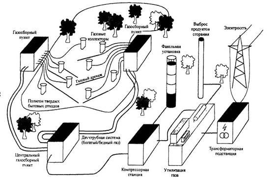На полигонах ТБО образующийся биогаз собирается с помощью систем горизонтальных или вертикальных труб (часто их используют совместно). Эти тубы диаметром 10-15 см по всей длине имеют щели и отверстия, через которые проникает газ. Горизонтальные трубы закладываются, как правило, на ранних этапах создания полигона ТБО, а вертикальные могут закладываться заранее (что намного дешевле) либо буриться после. Трубы обязательно обсыпаются дренажным материалом (щебенка). Биогаз через систему вертикальных и горизонтальных труб, расположенных в толще ТБО, поступает в газопровод, а затем в газосборный пункт, которых может быть несколько. После главного газосборного пункта газ идет на системы очистки, затем на компрессорные устройства, для создания давления, необходимого для дальнейшего транспорта газа по трубопроводам к месту его потребления.