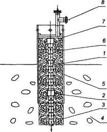 Во избежание расходов на бурение при эксплуатации полигона газовые скважины можно сооружать в процессе заполнения полигона. Технологию проведения работ можно коротко описать так: обсадная труба из стали или синтетических материалов поэтапно возводится одновременно с засыпкой отходов таким образом, чтобы на глубине не менее 2 м (при общей длине около 5 м) она оставалась бы в толще отходов, затем вносится следующий слой отходов примерно на 2 м и уплотняется. Уплотнитель (компактор или бульдозер) может при укладке отходов подъезжать вплотную к обсадной трубе. Затем обсадная труба снова поднимается на 3 м, труба колодца наращивается, а кольцевой зазор засыпается щебнем. За исключением собственно процесса вытягивания обсадной трубы газовая скважина может все время быть соединена с газосборной сетью. Устройство и пример конструкции такой обсадной трубы представлены на рис. 3.
