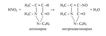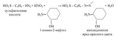 . При взаимодействии смеси сульфаниловой кислоты и 1-амино-2-нафтола с нитритами в нейтральных или уксуснокислых растворах образуется азокраситель ярко-красного цвета (реакция Грисса):