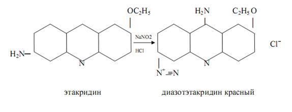 (риванол) в кислой среде образует с нитратами диазоэтакридин красного цвета: