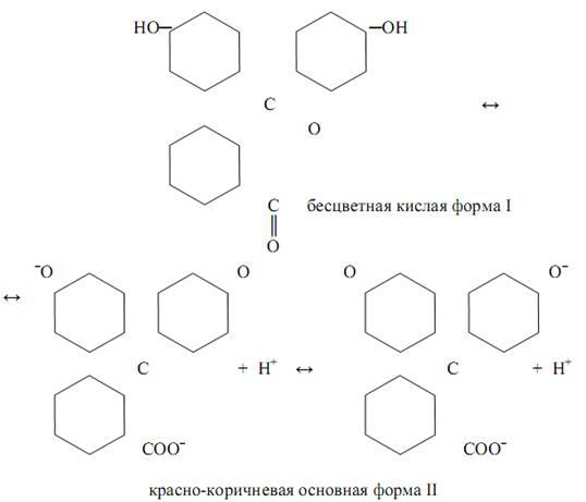 При изменении рН растворов, а именно при подкислении равновесие смещается влево – в сторону кислой формы и после понижения рН до такого значения рН1, когда в растворе доминирует эта форма, раствор принимает окраску формы I. При уменьшении концентрации ионов водорода равновесие смещается вправо – в сторону основной формы II. В случае индикатора фенолфталеина схему можно упрощённо представить следующим образом: