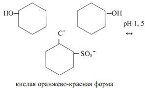 Таутомерная форма I не имеет хромофорной группы и поэтому бесцветна, а форма II обладает хиноидным хромофором и поэтому окрашена в красный цвет. Другой пример виден у индикатора метиловый оранжевый, который является натриевой солью диметиламиноазобензол-сульфокислоты (CH3