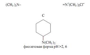 Интервал перехода окраски индикатора наблюдается в пределах рН от ~6, 8 (жёлтая) до ~8, 4 (красная). К собственно трифенилметановым красителям относятся кристаллический фиолетовый, малахитовый зелёный, метиловый фиолетовый, пентаметоксикрасный, гексаметоксикрасный. Одним из индикаторов данной группы является кристаллический фиолетовый (кристаллвиолет):