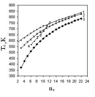 Р и с. 5.1. Зависимость критической температуры от числа углеродных атомов в молекуле: