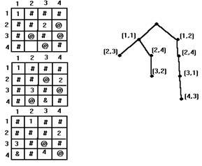 для N=8) возможностей. Никакие два ферзя не могут находиться на одной диагонали, это сокращает число возможностей еще больше (для N=8 в дереве остается 2056 узлов). Итак, с помощью ряда наблюдений мы исключили из рассмотрения большое число возможных расстановок N ферзей на доске размером N*N. Использование подобного анализа для сокращения процесса перебора называется поиском с ограничениями или отсечением ветвей в связи с тем, что при этом удаляются поддеревья из дерева. Второе. Другим усовершенствованием является слияние, или склеивание, ветвей. Идея состоит в том, чтобы избежать выполнения дважды одной и той же работы: если два или больше поддеревьев данного дерева изоморфны, мы хотим исследовать только одно из них. В задаче о ферзях мы можем использовать склеивание, заметив, что если а1