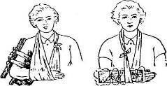 Рис. 10. Иммобилизация предплечья с помощью суповой ложки и верхней конечности с помощью косынки.