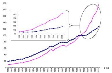 Начиная со второй половины XX в. рост внешней торговли России приобрел взрывной характер. В период 1950-2003 гг. объем мирового экспорта, рассчитанный в неизменных ценах, вырос в 21,8 раза (среднегодовой темп роста – 6,4%). За этот же период мировое производство выросло в 7,1 раза (среднегодовой темп роста – 4,0%).[6]