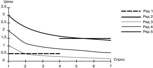 Рис. 1. Предложениесевера (1) и Юга (2) и мировой спрос (3, 4, 5 )