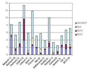 Доля мигрантов из новых стран-членов в старых странах (нас интересуют Словения, Румыния и Болгария как представительницы ЮВЕ) — членах ЕСИсточник: BrückerandDamelang, 2009