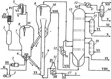 насос; I — сырье; II — воздух; III — топливный газ; IV — дымовые газы; V — вода; VI — пар; VII — циркулирующий остаток; VIII — остаток >420 °С; IX — тяжелый газойль; X — легкий газойль; XI — бензин; XII — газ; XIII — катализаторныйшлам