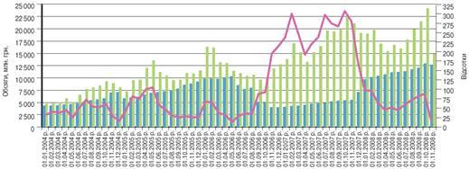 Як бачимо на графіку 1 в останні два роки найменший рівень вільної ліквідності спостерігався за станом на 1 листопада 2008 року: вільні резерви перевищили рівень обов'язкових резервних вимог лише на 17.1% порівняно з 87.4% на 01.10.2008 р., зменшившись при цьому на 9.1 млрд. грн. Така ситуація свідчить про зміну в Україні структурної позиції профіциту ліквідності банківської системи її структурним дефіцитом унаслідок світової фінансової кризи, яка загострила негаразди, що накопичилися у вітчизняній банківській системі.