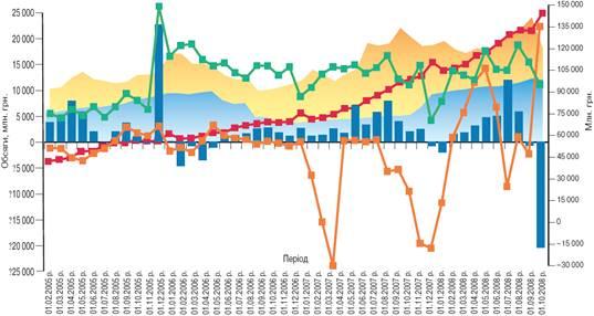 Графік 3. Динаміка кумулятивного впливу різних факторів на ліквідність банківської системи України в 2005-2008 рр.