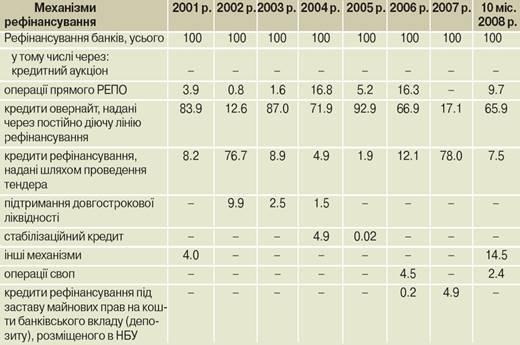 Нині для регулювання ліквідності банківської системи Національний банк використовує такі основні механізми рефінансування: кредити овернайт, надані через постійно діючу лінію рефінансування; кредити рефінансування, надані шляхом проведення тендера; операції прямого РЕПО з державними облігаціями України та операції своп, які у структурі обсягів кредитів, наданих Національним банком України, становили за 10 місяців 2008 року відповідно 65.9, 7.5, 9.7, 2.4% (див. таблицю 2).