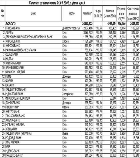 Таблица Б.3 Власний капитал перших 30 банківських установУкраїни станом на 01.01.2006 року [37]