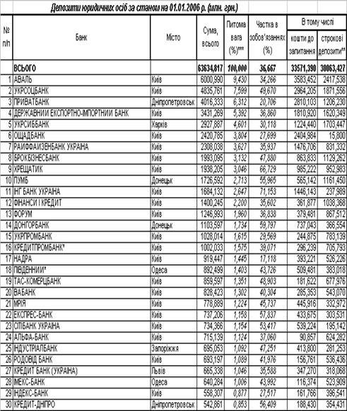 Таблиця Б.5. Депозити юридичних осіб в перших 30 комерційних банках України станом на 01.01.2006 року [37]
