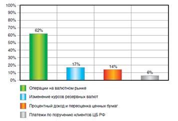 Однако главный источник пополнения международных резервов - операции на внутреннем валютном рынке. Исходя из данных Обзора деятельности Банка России по управлению резервными валютными активами они обусловливают 62% изменений международных резервов (рис. 2.1.1).