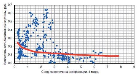 - величина интервенции относительно оборота валютного рынка;