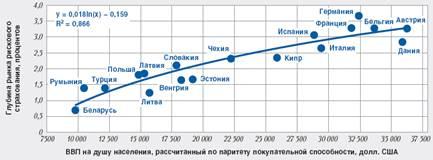 Рисунок 3 - Зависимость глубины рынка рискового страхования от ВВП на душу населения, рассчитанного по паритету покупательской способности, 2008 г.