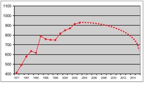 Рис. 2.14 Смертность населения РФ от болезней системы кровообращения; скорость снижения параметра примерно 3% в год