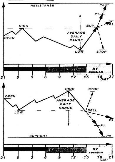 Техника открытия новой позиции - следующий самый важный элемент предварительного торгового планирования. Правила открытия новой позиции и входа в рынок являются многочисленными и требуют очень точной приверженности. Поскольку мы обсуждаем внутридневную торговлю, выбор точки входа представляет особенно важную и трудную задачу из-за ограниченного времени и места, которое не превышает ежедневный средний диапазон любого данного обменного курса. Мы должны всегда помнить и принимать во внимание тот факт, что в течение дня вся торговая деятельность отражает только "шум" рынка. Другими словами, на результат любой отдельной сделки очень влияют случайные движения рынка, и его хаотические колебания сопоставимы с ежедневным средним диапазоном. Поэтому тактика, которая может и должна быть применена к внутридневной торговле, может быть охарактеризована как техника “ударил и убежал”.
