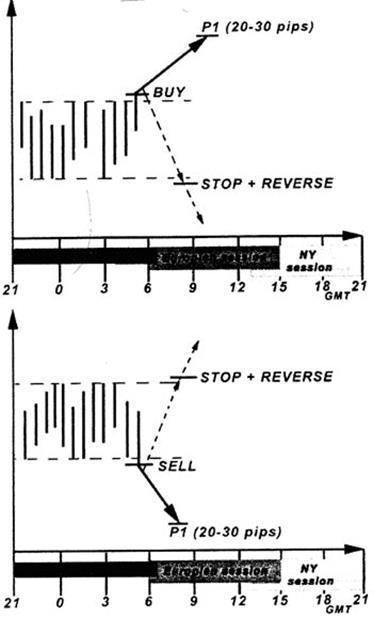 Это правило связано с тем фактом, что часто усиление активности европейских обменных курсов начинается только после открытия европейской торговой сессии. В течение азиатской сессии европейские валюты против USD и других не азиатских валют большинство времени торгуются пассивно в узком диапазоне, демонстрируя классическое поведение рынка в узком “боковом тренде”. Есть редкие исключения к этому правилу, когда я считаю возможной короткую (20-40 pips) торговлю с напряженными остановками и ликвидацией позиции до начала европейской сессии. Эта ситуация не случается очень часто, и я не жду многого от этой торговли. Со времени, когда я был абсолютно зеленым новичком и торговал без остановок, я хорошо помнил, что длинные длительные позиции наказывались за быструю прибыль. Поэтому я не рекомендую такую торговлю моим студентам (особенно новичкам), и я не планирую описывать эту технологию в данном курсе.