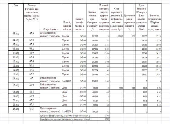 Таблиця 2 - Поточний рахунок клієнта в розрахунковій палаті біржі та результати біржової гри на курсах ф’ючерсних контрактів