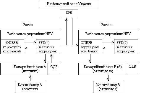 (5) — РРП відображає отримані електронні розрахункові документи по технічному коррахунку банку-отримувача після підтвердження від банку В (наприклад, того ж регіону); по каналах електронного зв'язку передає документи банку-отримувачу В;