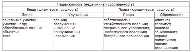 Юридическую сущность составляют: право собственности, право хозяйственного ведения, право оперативного управления, право пожизненного наследуемого владения, право постоянного пользования, ипотеку, сервитуты, а также иные права в случаях, предусмотренных ГК РФ и иными законами.