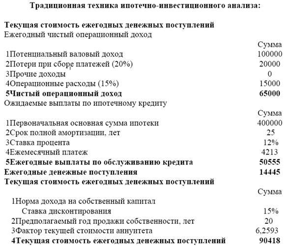 Техника ипотечно-инвестиционного анализа - это техника оценки стоимости, приносящей доход собственности (недвижимости), основанная на сложении основной суммы ипотечного долга с дисконтированной текущей стоимостью будущих денежных поступлений и выручки от перепродажи актива.