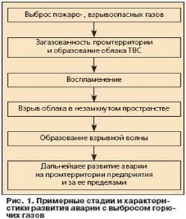 Аварийная утечка горючих газов (в том числе сжиженных), легковоспламеняющихся жидкостей (ЛВЖ), а также их залповый выброс из поврежденной части технологического оборудования являются непосредственными источниками загазованности открытых установок потенциально опасных предприятий. В общем случае ход развития подобных аварий можно разделить на несколько стадий (рис. 1).