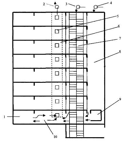1 - квартира (помещение),2 - вытяжной вентилятор, 3,4 - приточные вентиляторы,5 - клапан дымоудаления,6 - шахта дымоудаления,7 - незадымляемая лестничная клетка второго типа (Н2),8 - шахта лифтов,9 - лифт, 10 - коридор, - ► - направления движения воздушных потоков.