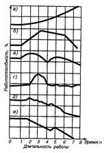 Влияние специфики выполняемой работы характеризует рис. 2.2, где a— легкая физическая нагрузка и рациональная скорость выполнения операций; б — обслуживание сложного пульта управления; в — средняя физическая нагрузка; г — значительная физическая нагрузка при большой концентрации внимания и выполнения быстрых и точных движений; д — простые зрительные работы; е — сложные зрительные работы.