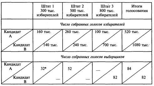*Примечание. Число выборщиков 32 определяется следующим образом: 30 (по числу представителей - 300 тыс.: 10 тыс. = 30) + 2 (по числу сенаторов). Аналогично и в других штатах.