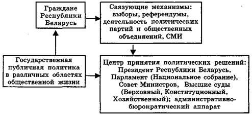Центры принятия политических решений осуществляют государственное управление. Государственное управление - это наука о характере и функциях государства и его правительства как органа, через который государство реализует свою власть, о целенаправленном курсе действий органов власти по формированию и реализации важнейших направлении государственной политики, о сущности и содержании процессов принятия политических (управленческих) решений. По сути, управленческие решения, являясь видом человеческой деятельности, составляют суть государственного управления. Центры принятия важнейших государственных решений в Республике Беларусь: Президент Республики Беларусь, Правительство (Совет Министров), Парламент (Национальное собрание), система судов. Центры принятия политических решений реагируют на политическую повестку, вырабатывая государственную политику.