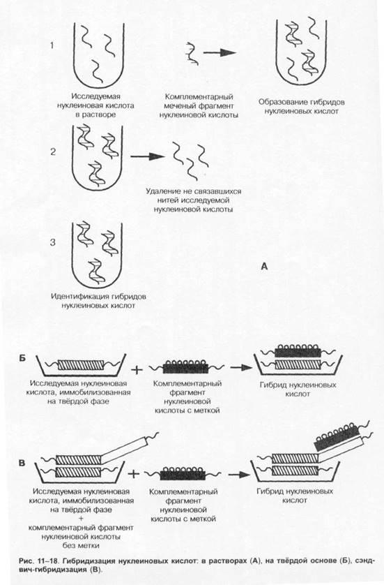 — высокоспецифичный метод, позволяющий идентифицировать геном вируса после его гибридизации комплементарными молекулами ДНК. В качестве маркёра применяют ферменты и изотопы. Метод определяет способность вирусной ДНК гибридизироваться с меченой комплементарной ДНК; специфичность метода прямо пропорциональна длине I комплементарной цепочки. Перспективен метод гибридизации нуклеиновых кислот