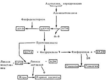 Рассмотренные влияния катехоламинов — адреналина и норадреналина — могут быть непосредственными, но чаще — опосредованными. Посредником действия катехоламинов, как и многих других гормонов, является открытая американским биохимиком Е.В. Сатерлендом цАМФ, образующаяся из АТФ под действием фермента аденилатциклазы. Катехоламины, связываясь с клеточными рецепторами, активируют аденилатциклазу, что приводит к повышению концентрации цАМФ в клетке. Эта концентрация регулируется двумя ферментами: аде-нилатциклазой, синтезирующей цАМФ, и фосфодиэсте-разой, расщепляющей ее.